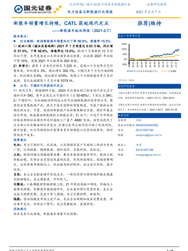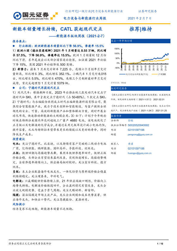 【国元证券】【20210207】新能车销量增长持续,CATL获起现代定点-10页