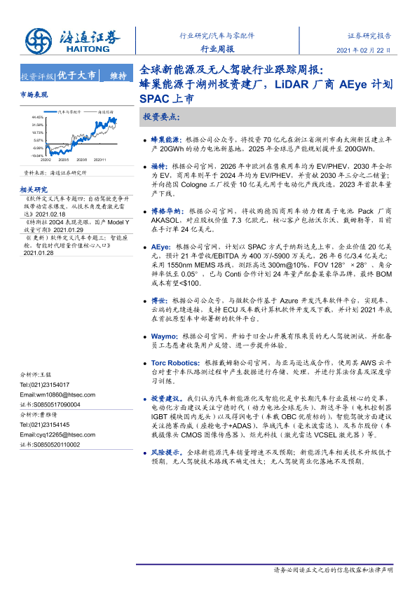 【海通证券】【20210222】全球新能源及无人驾驶行业跟踪周报:蜂巢能源于湖州投资建厂,LiDAR厂商AEye计划SPAC上市-2页