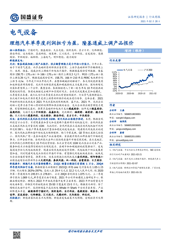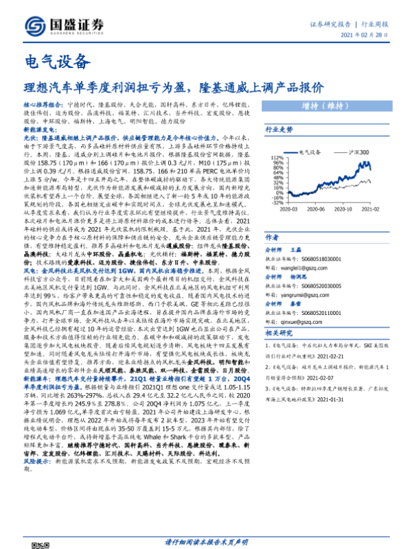 【国盛证券】【20210228】电气设备行业周报:理想汽车单季度利润扭亏为盈,隆基通威上调产品报价-14页