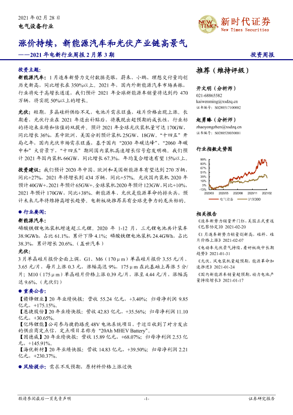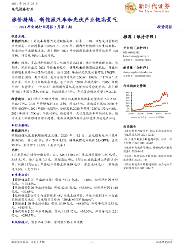 【新时代证券】【20210228】2021年电新行业周报2月第3期:涨价持续,新能源汽车和光伏产业链高景气-13页