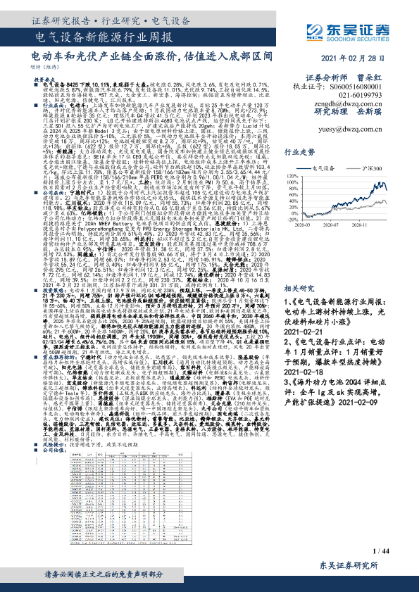 【东吴证券】【20210228】电气设备新能源行业周报:电动车和光伏产业链全面涨价,估值进入底部区间-44页