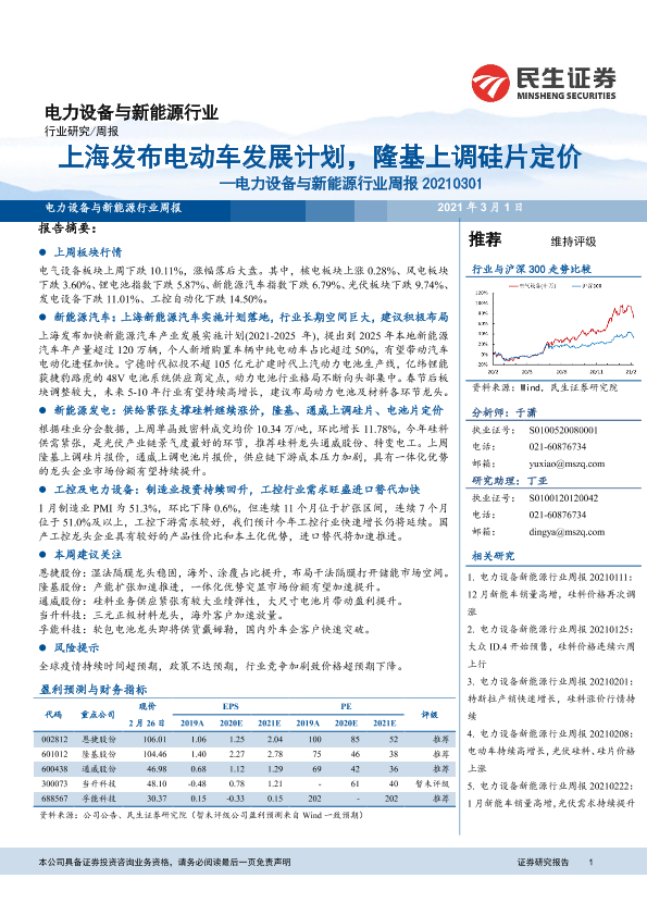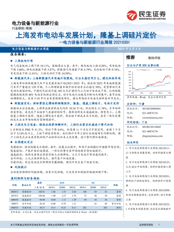 【民生证券】【20210301】电力设备与新能源行业周报:上海发布电动车发展计划,隆基上调硅片定价-17页