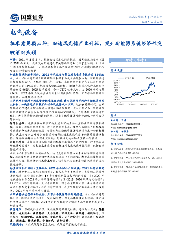 【国盛证券】【20210303】电气设备:征求意见稿点评:加速风光储产业升级,提升新能源系统经济性突破消纳瓶颈-3页