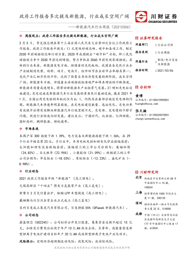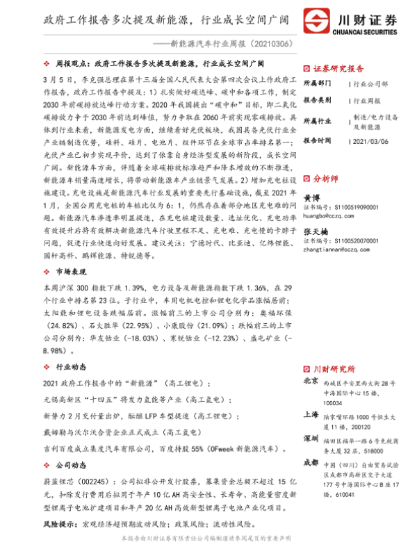 【川财证券】【20210306】20210306-川财证券-新能源汽车行业周报:政府工作报告多次提及新能源,行业成长空间广阔-15页
