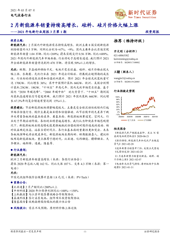 【新时代证券】【20210307】2021年电新行业周报3月第1期:2月新能源车销量持续高增长,硅料、硅片价格大幅上涨-13页