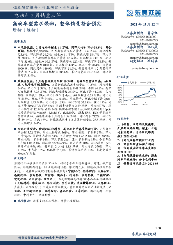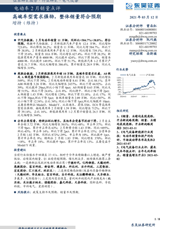 【东吴证券】【20210312】电动车2月销量点评:高端车型需求强劲,整体销量符合预期-8页