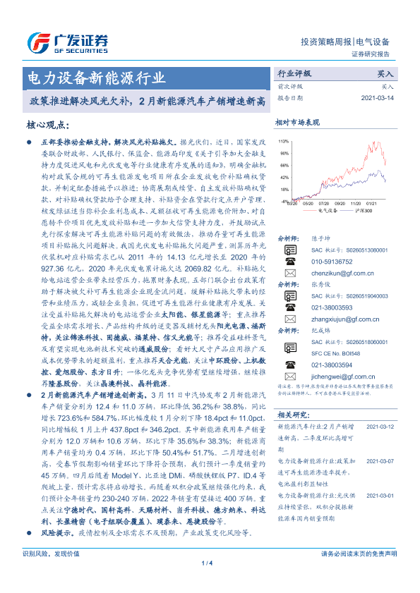 【广发证券】【20210314】电力设备新能源行业投资策略周报:政策推进解决风光欠补,2月新能源汽车产销增速新高-4页
