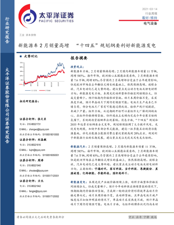 【太平洋证券】【20210314】20210314-太平洋-电气设备行业周报:新能源车2月销量高增“十四五”规划纲要利好新能源发电-16页