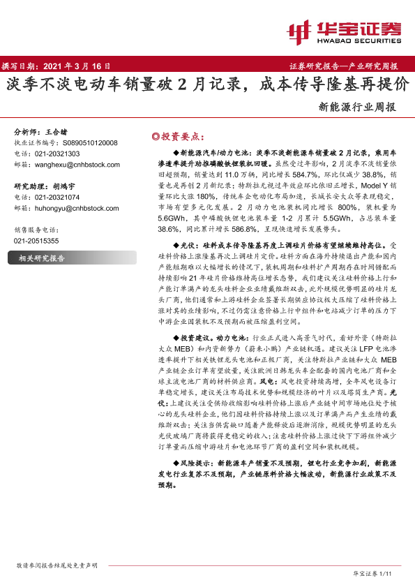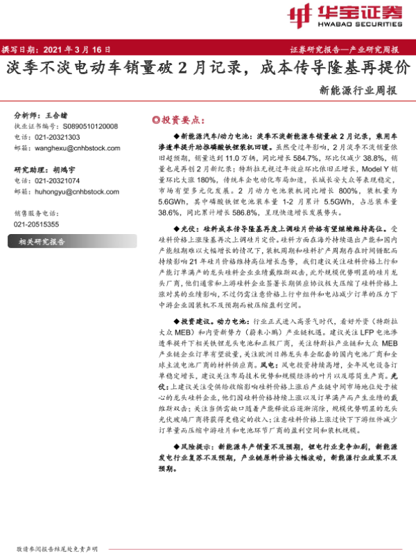 【华宝证券】【20210316】20210316-华宝证券-新能源行业周报:淡季不淡电动车销量破2月记录,成本传导隆基再提价-11页