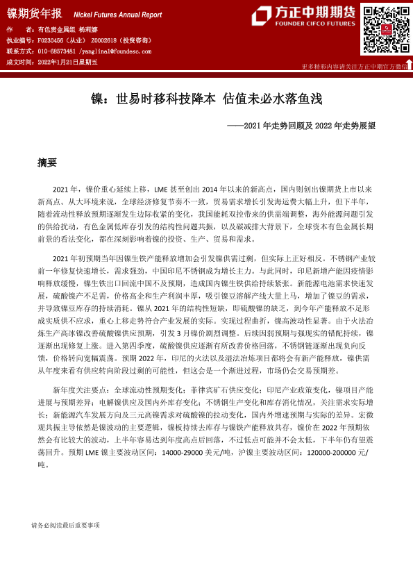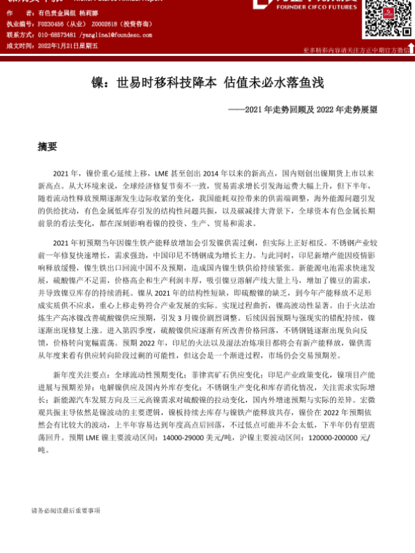 【方正中期期货】【20220121】镍2021年走势回顾及2022年走势展望:世易时移科技降本,估值未必水落鱼浅-40页