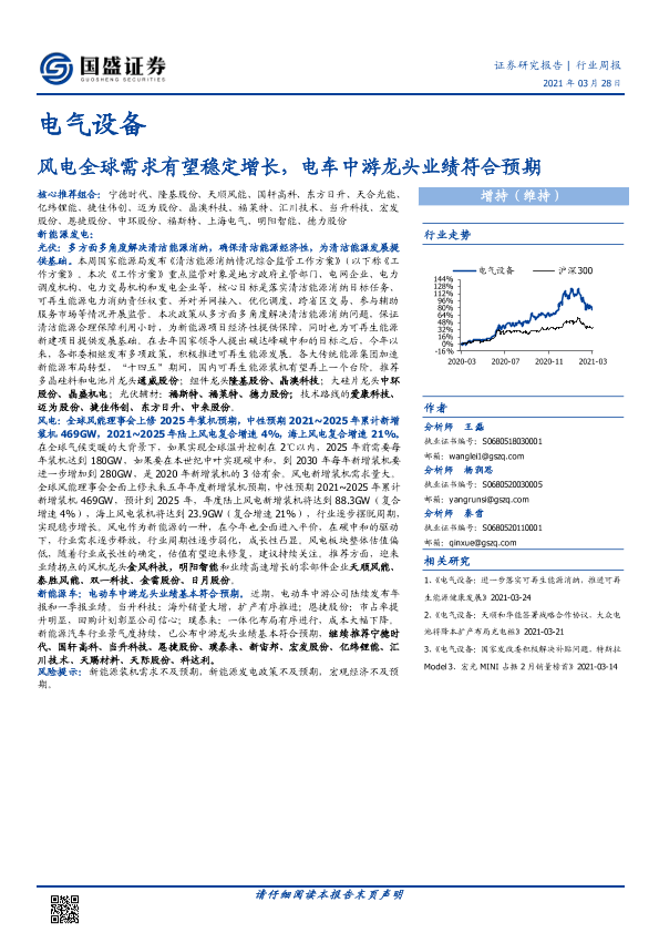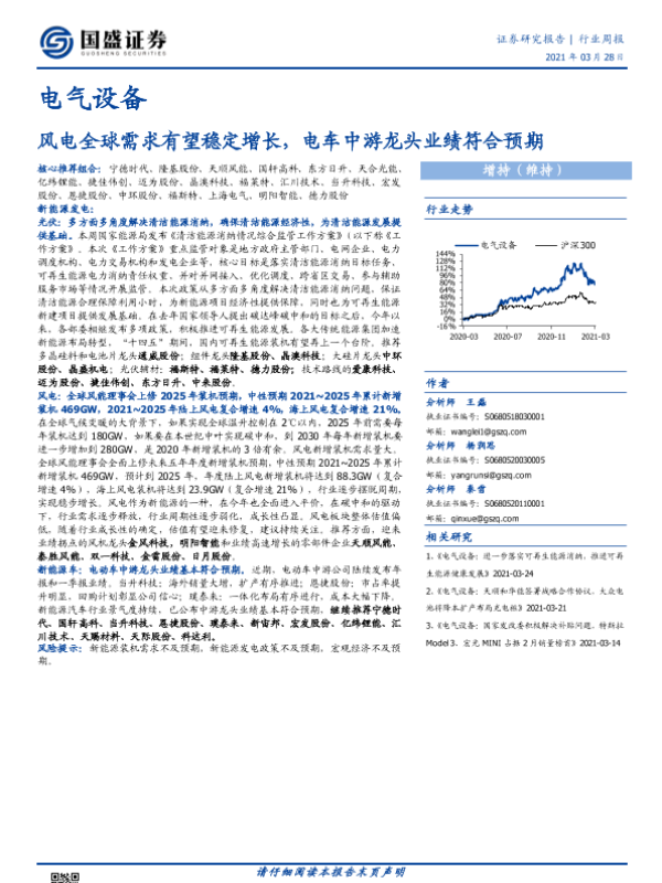 【国盛证券】【20210328】电气设备行业周报:风电全球需求有望稳定增长,电车中游龙头业绩符合预期-14页