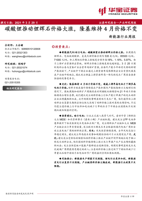 【华宝证券】【20210329】20210329-华宝证券-新能源行业周报:碳酸锂推动锂辉石价格大涨,隆基维持4月价格不变-19页