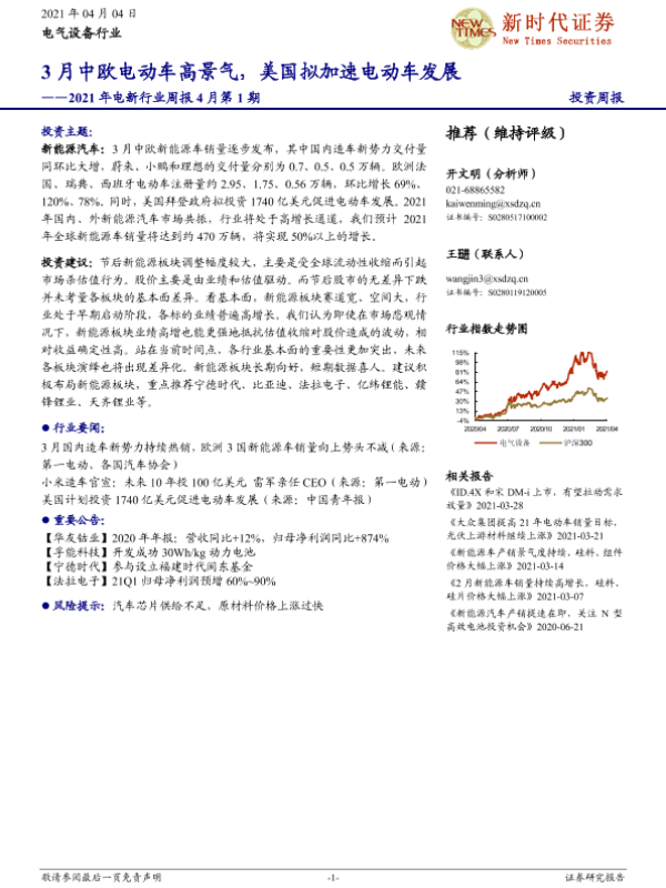 【新时代证券】【20210404】2021年电新行业周报4月第1期:3月中欧电动车高景气,美国拟加速电动车发展-10页