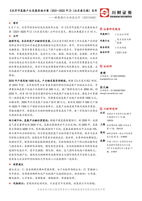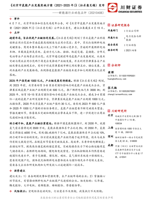 【川财证券】【20210408】20210408-川财证券-新能源行业动态点评:《北京市氢能产业发展实施方案(2021-2025年)》(征求意见稿)发布-2页