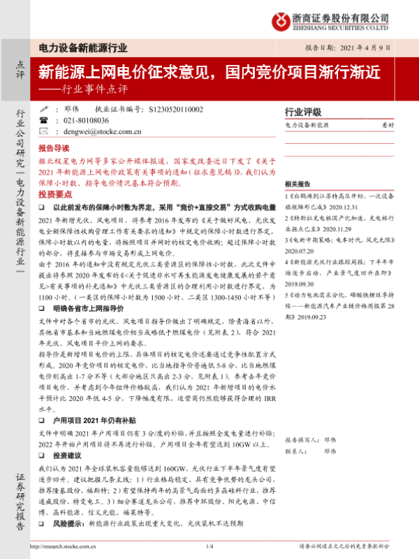 【浙商证券】【20210409】电力设备新能源行业事件点评:新能源上网电价征求意见,国内竞价项目渐行渐近-4页