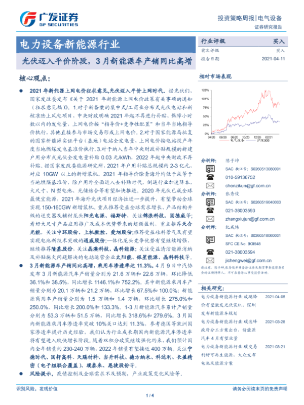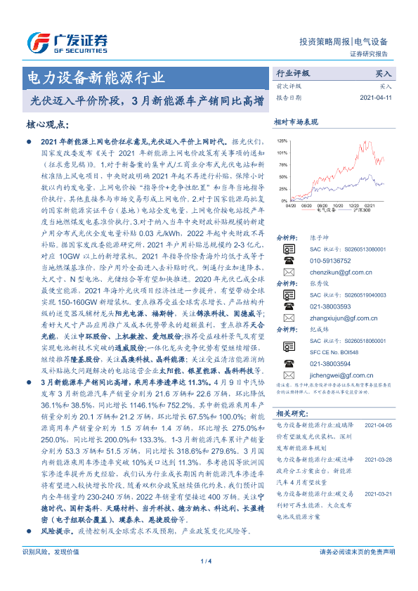 【广发证券】【20210411】电力设备新能源行业:光伏迈入平价阶段,3月新能源车产销同比高增-4页
