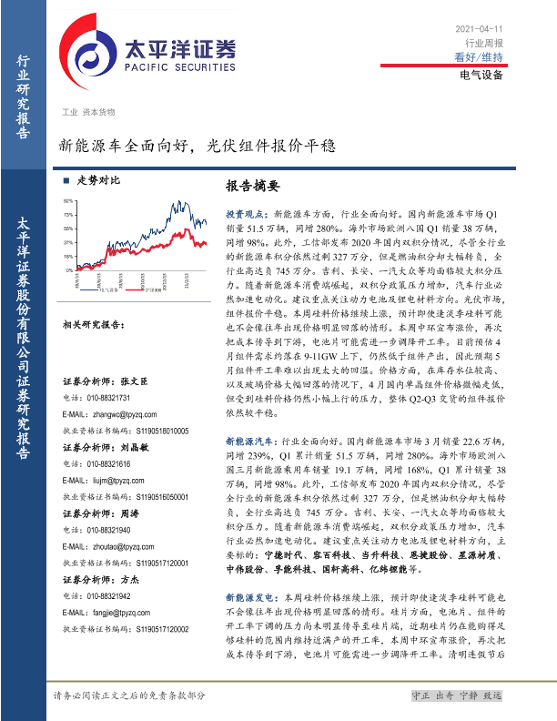 【太平洋证券】【20210411】20210411-太平洋-电气设备行业周报:新能源车全面向好,光伏组件报价平稳-15页