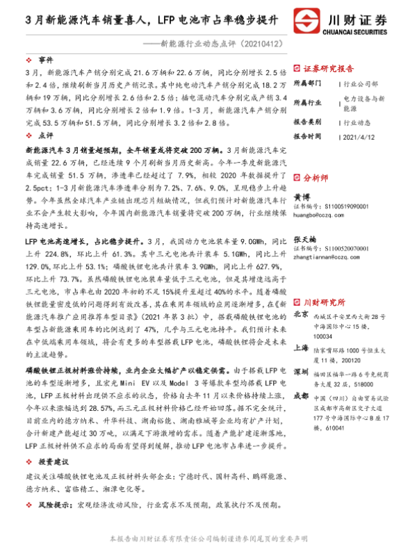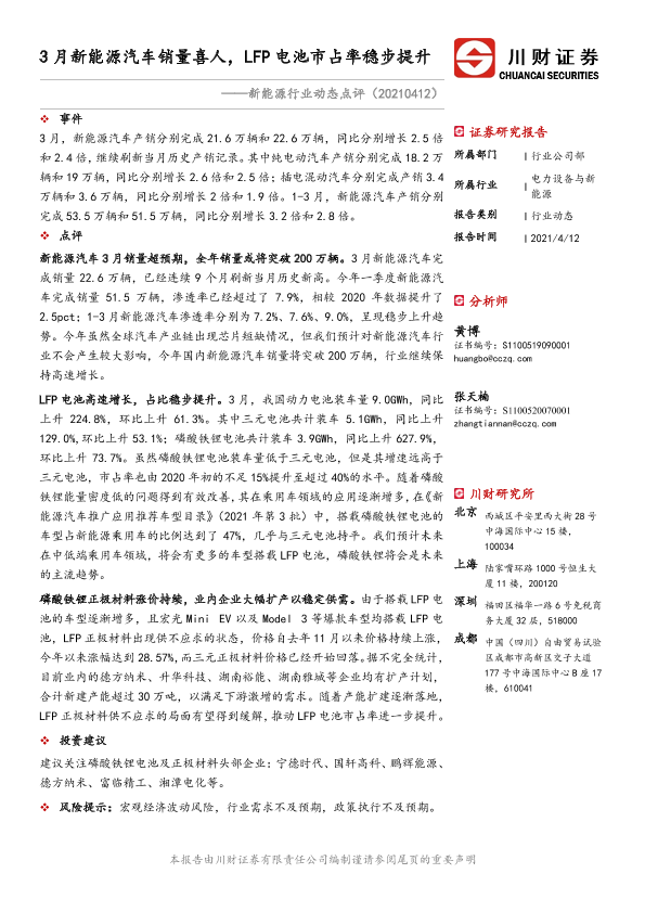 【川财证券】【20210412】3月新能源汽车销量喜人,LFP电池市占率稳步提升-2页