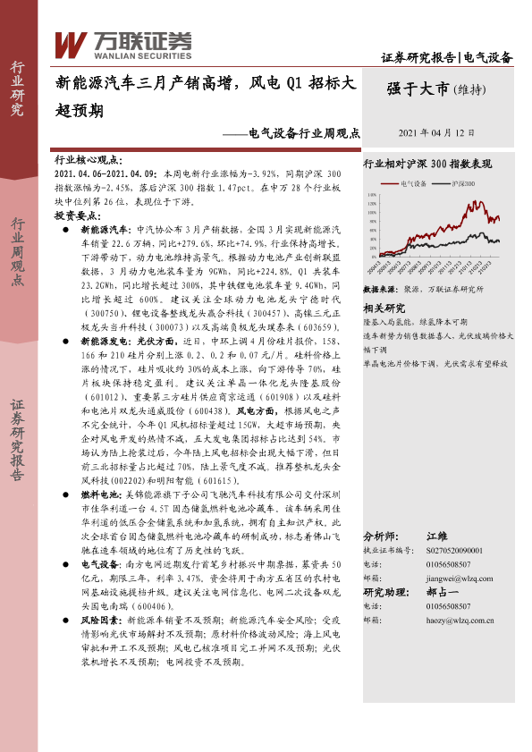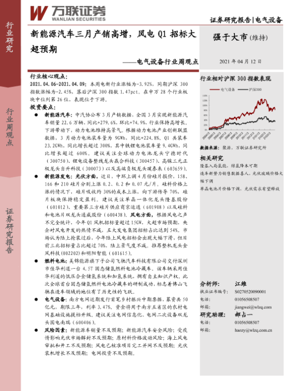 【万联证券】【20210412】电气设备行业周观点:新能源汽车三月产销高增,风电Q1招标大超预期-11页