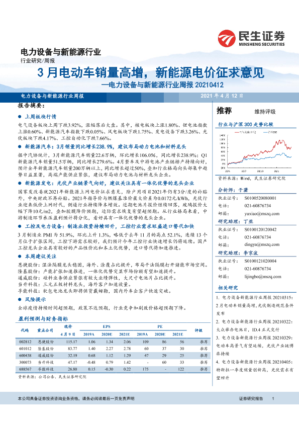 【民生证券】【20210412】电力设备与新能源行业周报:3月电动车销量高增,新能源电价征求意见-16页