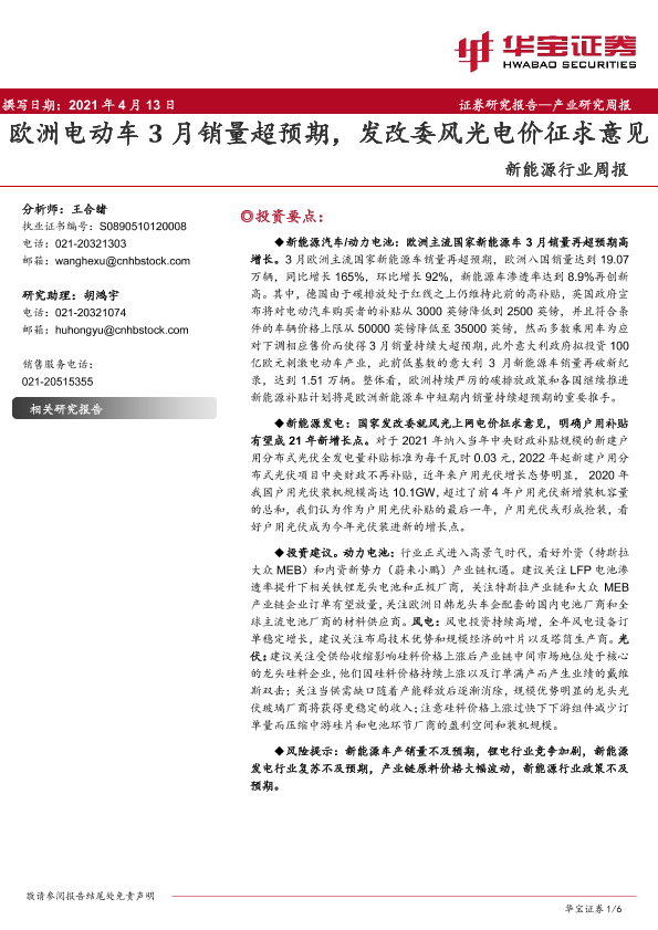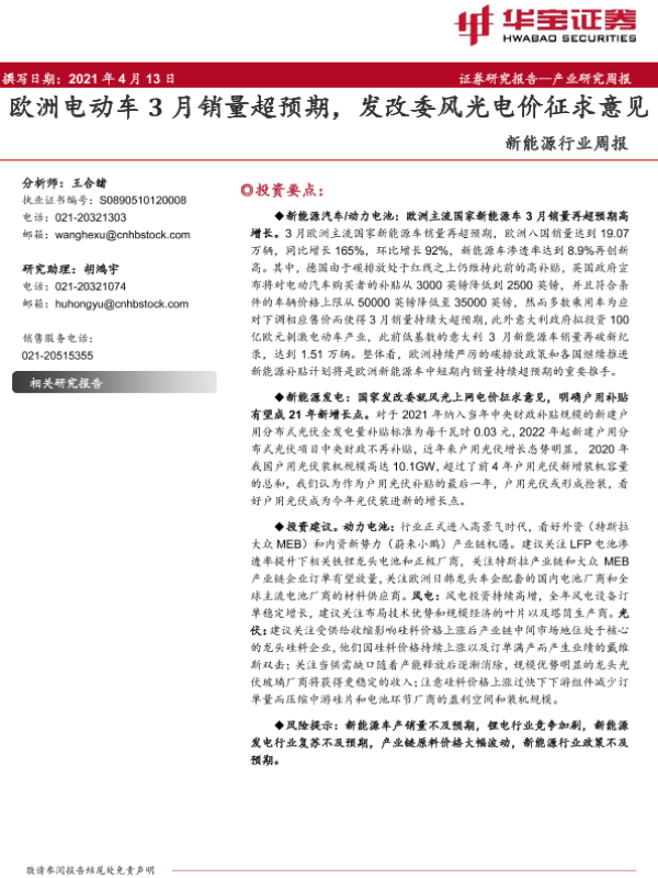 【华宝证券】【20210413】20210413-华宝证券-新能源行业周报:欧洲电动车3月销量超预期,发改委风光电价征求意见-6页