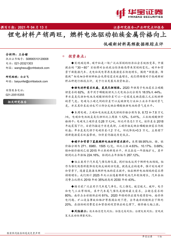【华宝证券】【20210413】20210413-华宝证券-低碳新材料高频数据跟踪点评:锂电材料产销两旺,燃料电池驱动铂族金属价格向上-6页