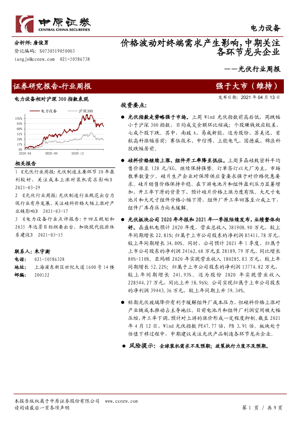 【中原证券】【20210413】光伏行业周报:价格波动对终端需求产生影响,中期关注各环节龙头企业-9页