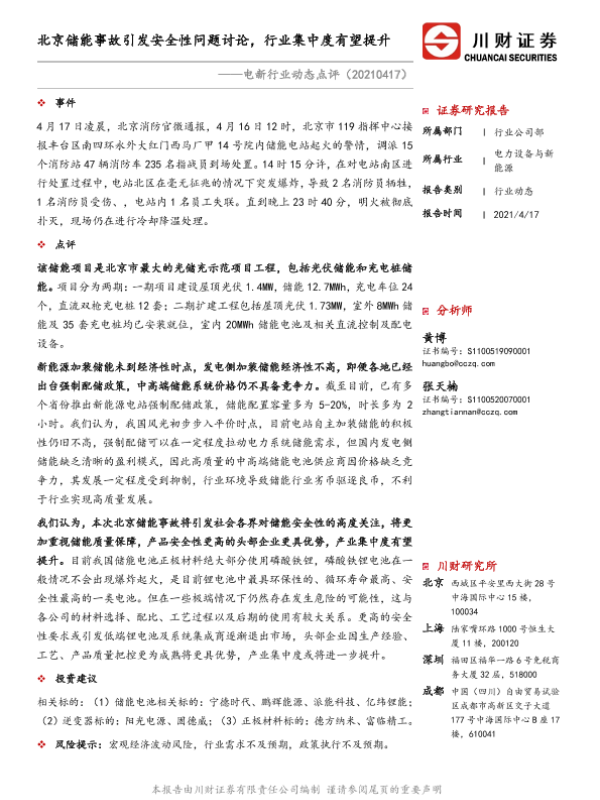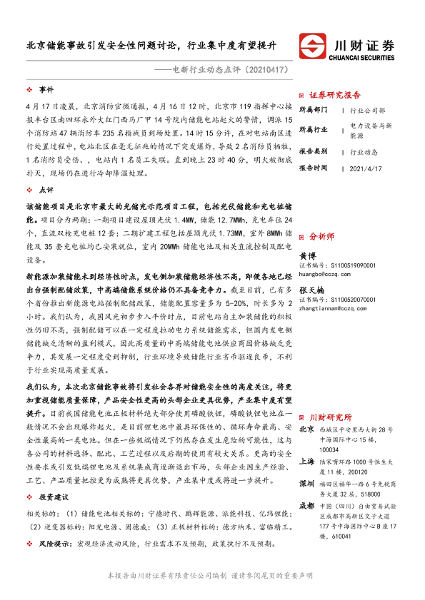 【川财证券】【20210417】电新行业动态点评:北京储能事故引发安全性问题讨论,行业集中度有望提升-2页