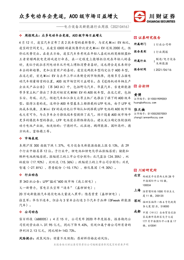 【川财证券】【20210416】电力设备及新能源行业周报:众多电动车企竞逐,A00级市场日益增大-16页
