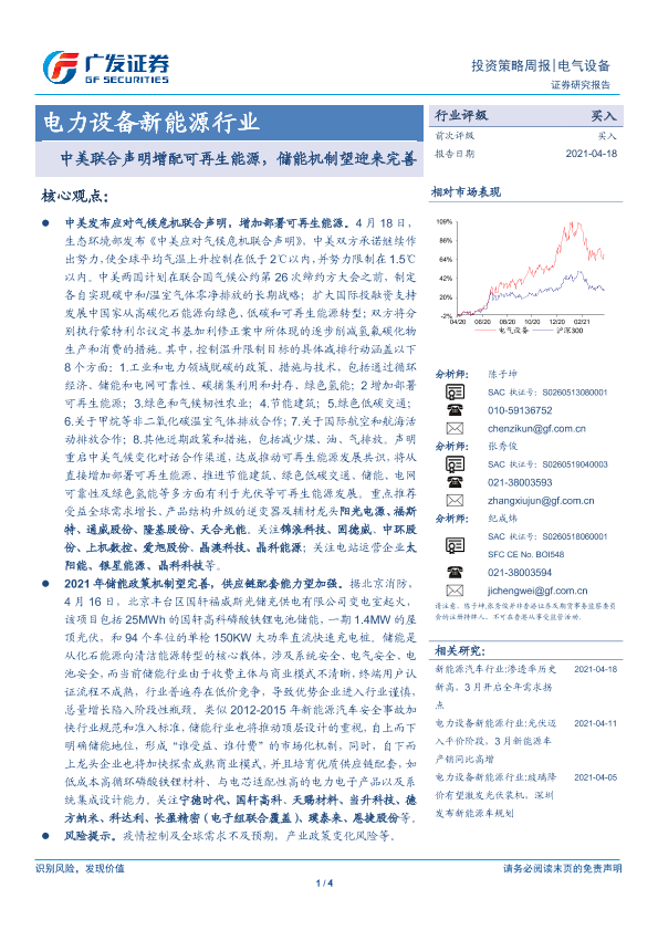 【广发证券】【20210418】电力设备新能源行业:中美联合声明增配可再生能源,储能机制望迎来完善-4页