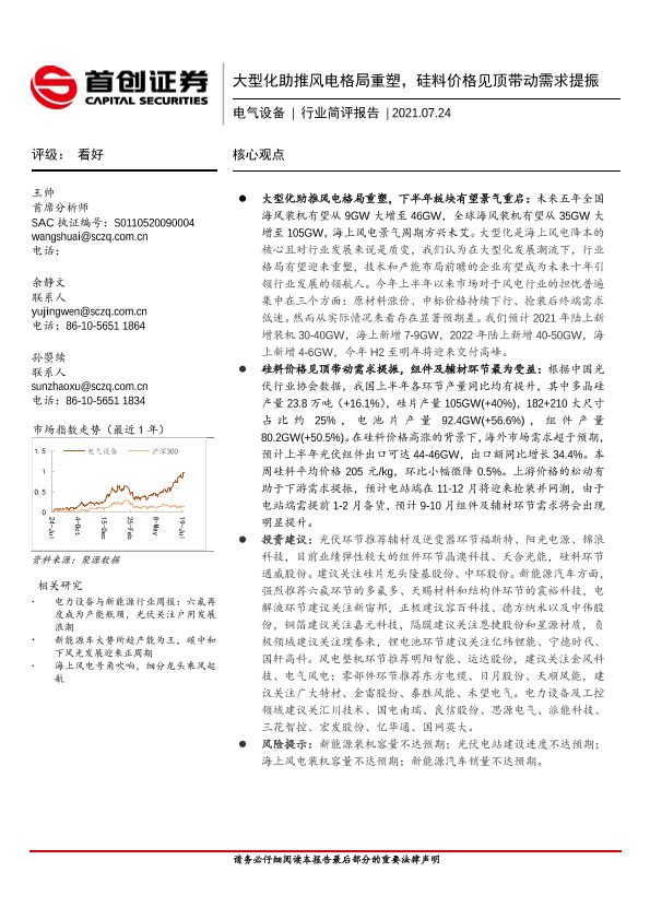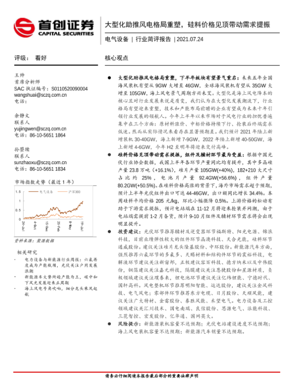 【首创证券】【20210724】电气设备行业简评报告:大型化助推风电格局重塑,硅料价格见顶带动需求提振-17页