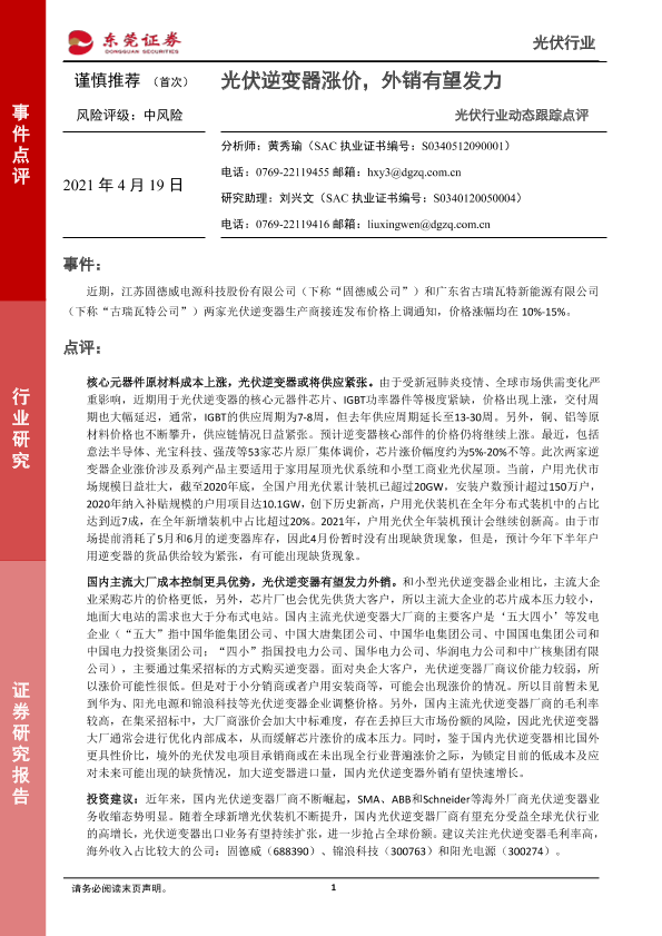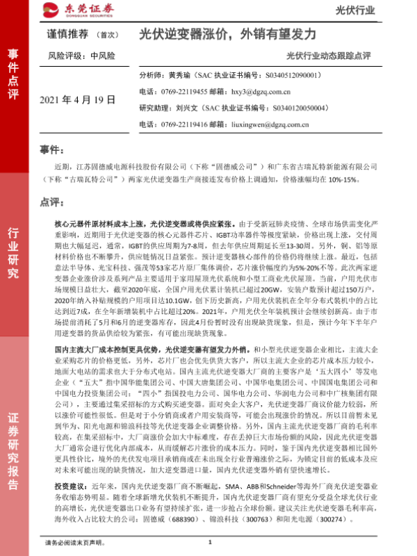 【东莞证券】【20210419】光伏行业动态跟踪点评:光伏逆变器涨价,外销有望发力-3页