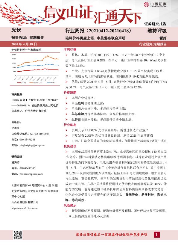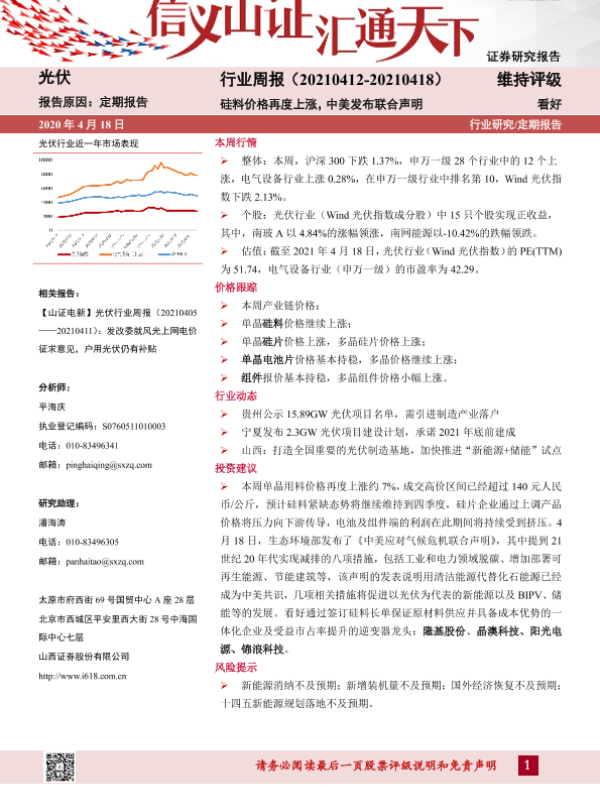 【山西证券】【20210418】20210418-山西证券-光伏行业周报:硅料价格再度上涨,中美发布联合声明-10页
