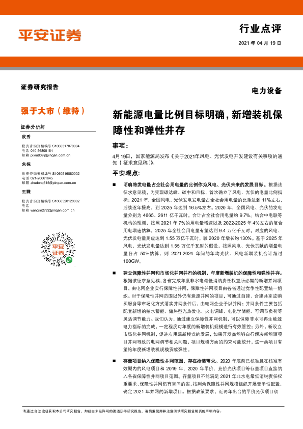 【平安证券】【20210419】电力设备行业点评:新能源电量比例目标明确,新增装机保障性和弹性并存-3页