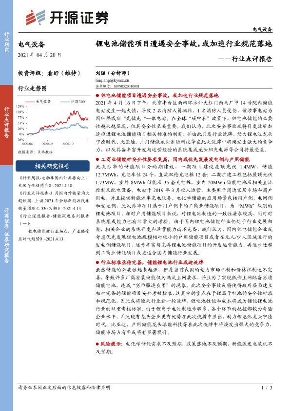 【开源证券】【20210420】锂电池储能项目遭遇安全事故,或加速行业规范落地-3页