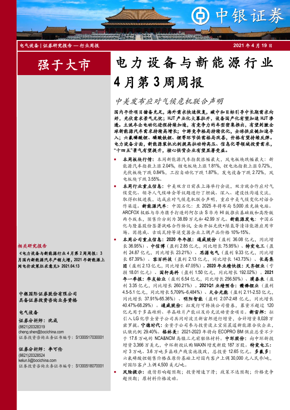 【中银证券】【20210419】电力设备与新能源行业4月第3周周报:中美发布应对气候危机联合声明-14页