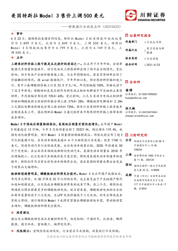 【川财证券】【20210423】美国特斯拉Model 3售价上调500美元-2页