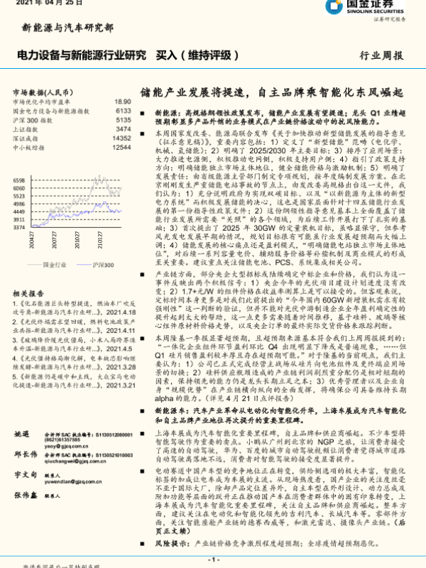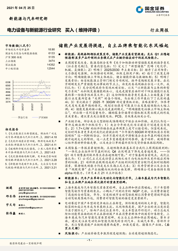 【国金证券】【20210425】电力设备与新能源行业研究:储能产业发展将提速,自主品牌乘智能化东风崛起-5页