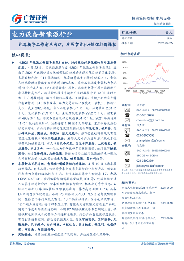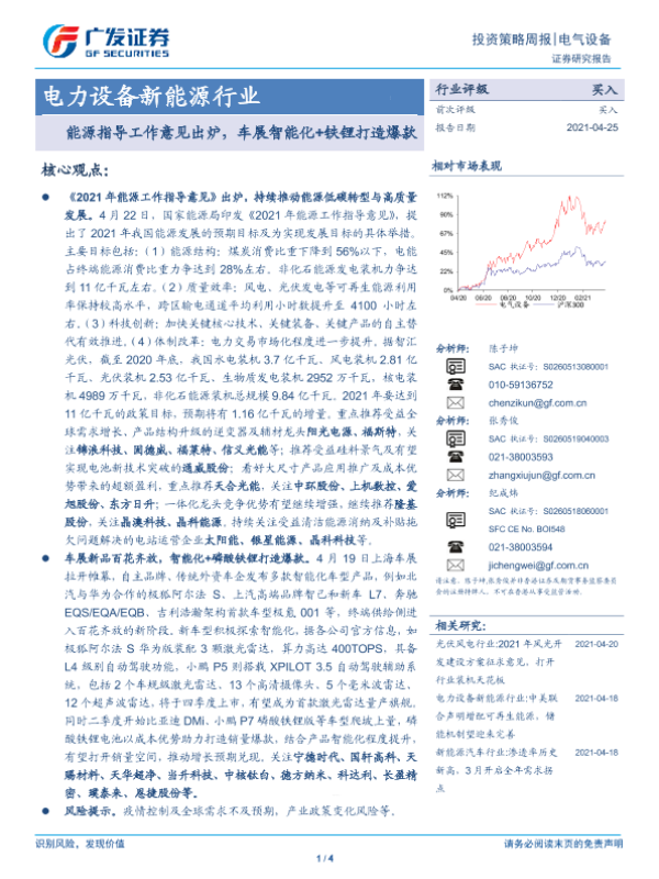 【广发证券】【20210425】20210425-广发证券-电力设备新能源行业投资策略周报:能源指导工作意见出炉,车展智能化+铁锂打造爆款-4页