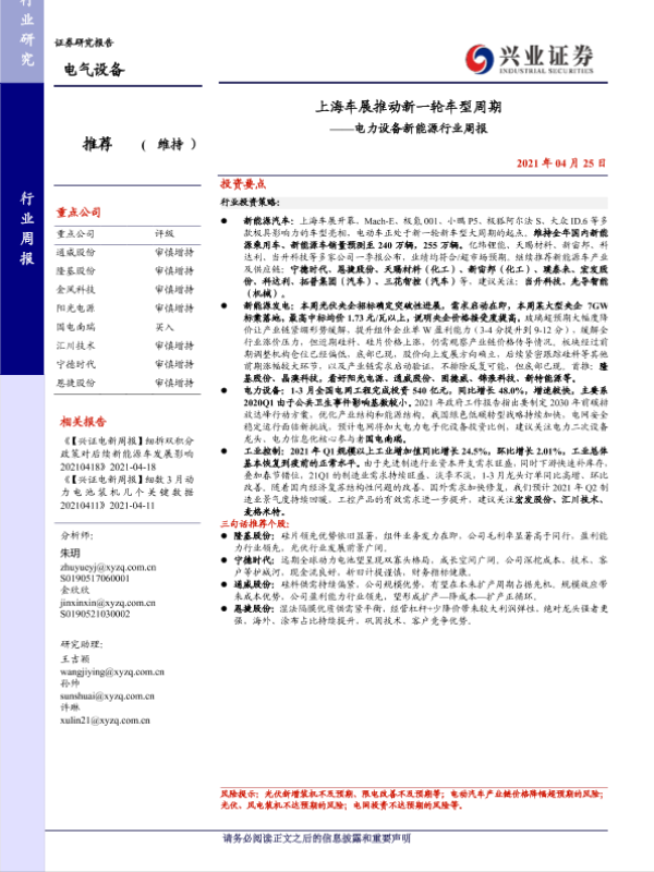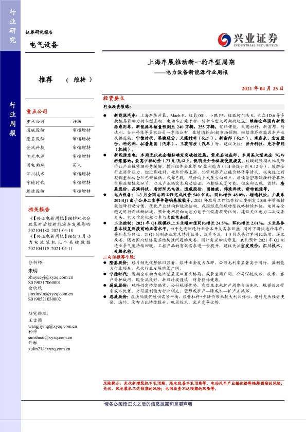 【兴业证券】【20210425】上海车展推动新一轮车型周期——电力设备新能源行业周报-26页