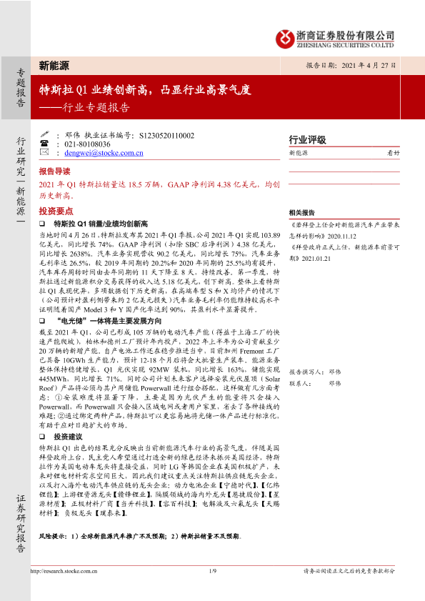 【浙商证券】【20210427】特斯拉Q1业绩创新高,凸显行业高景气度-9页