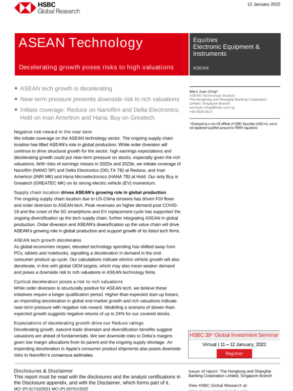 【The Hongkong and Shanghai Banking Corporation Limited】【20220112】HSBC-亚太地区科技行业-电子设备及仪器:增长减速会给高估值带来风险-63页