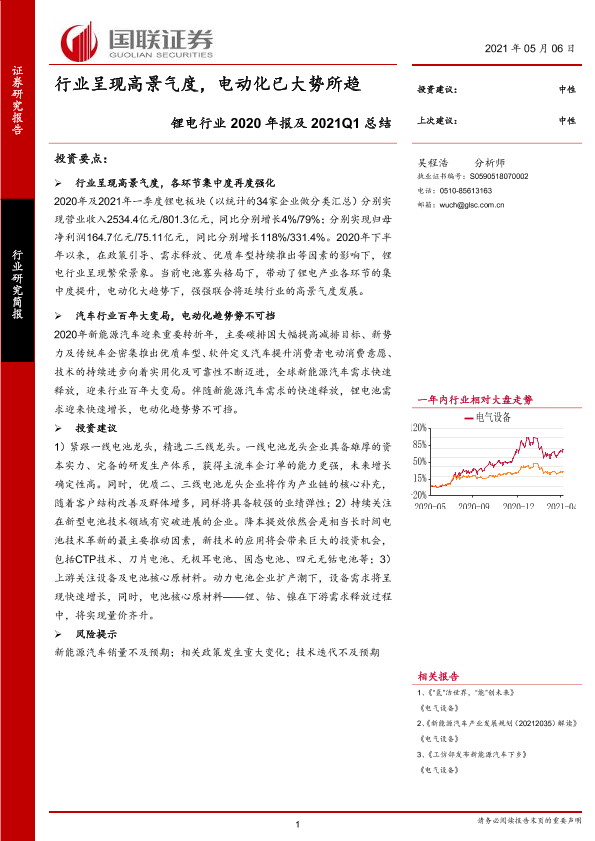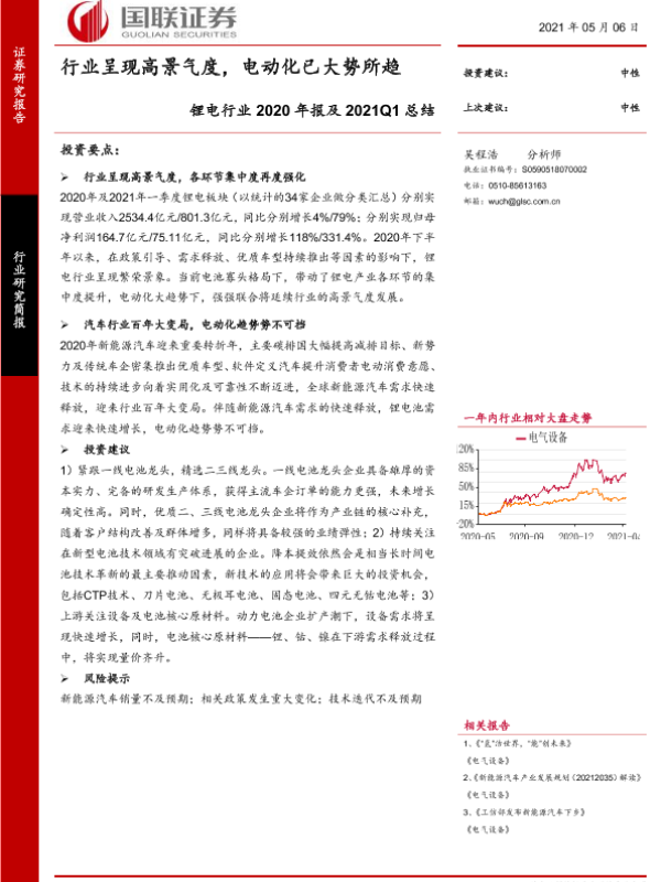 【国联证券】【20210506】锂电行业2020年报及2021Q1总结:行业呈现高景气度,电动化已大势所趋-19页