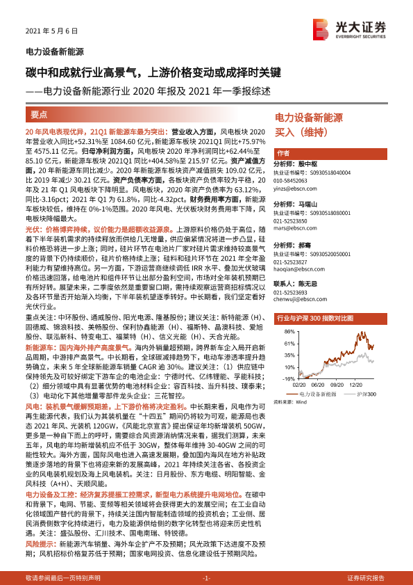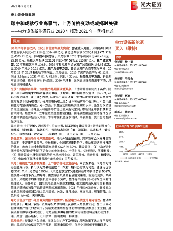 【光大证券】【20210506】电力设备新能源行业2020年报及2021年一季报综述:碳中和成就行业高景气,上游价格变动或成择时关键-26页