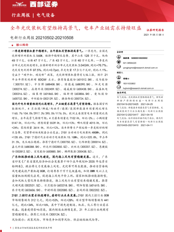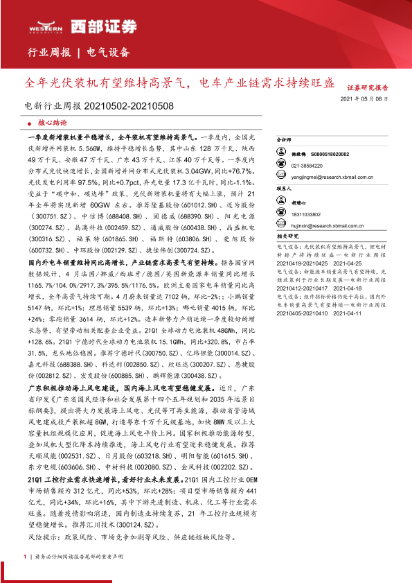【西部证券】【20210508】20210508-西部证券-电新行业周报:全年光伏装机有望维持高景气,电车产业链需求持续旺盛-13页