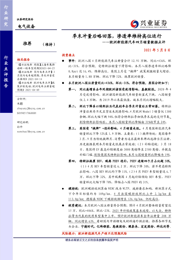 【兴业证券】【20210508】季末冲量后略回落,渗透率维持高位运行——欧洲新能源汽车四月销量数据点评-18页