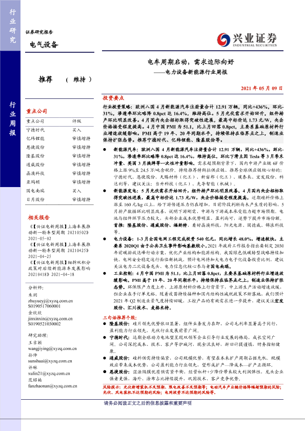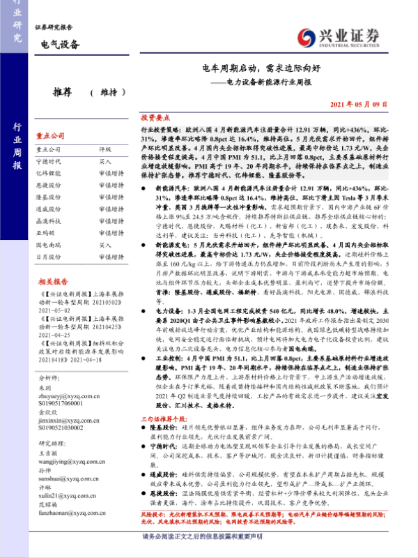 【兴业证券】【20210509】电车周期启动,需求边际向好——电力设备新能源行业周报-27页