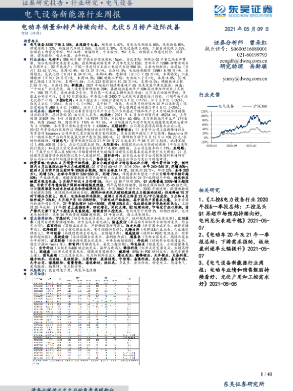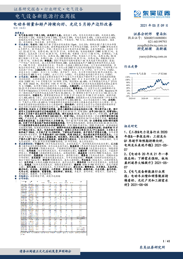 【东吴证券】【20210509】电气设备新能源行业周报:电动车销量和排产持续向好、光伏5月排产边际改善-41页