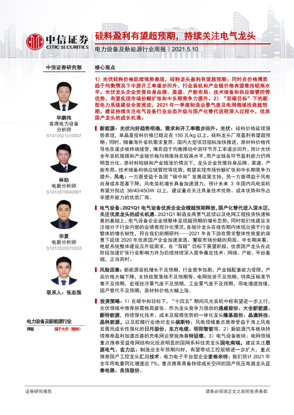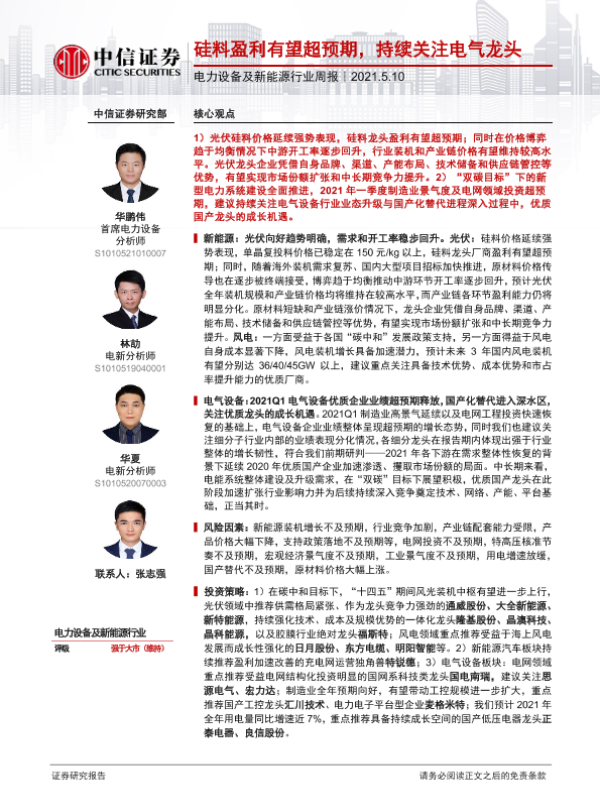 【中信证券】【20210510】电力设备及新能源行业周报:硅料盈利有望超预期,持续关注电气龙头-20页