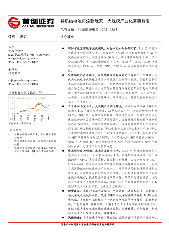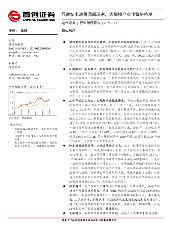【首创证券】【20210513】电气设备行业简评报告:异质结电池再添新玩家,大规模产业化蓄势待发-5页
